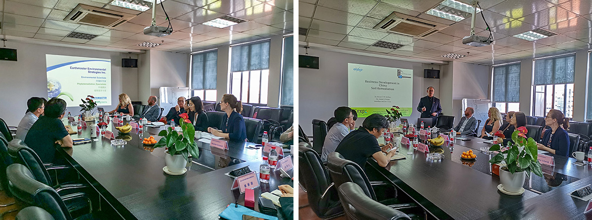 客人也分別介紹了自己公司的情況,Earthmaster業務發展副總裁Amber Flamand介紹該公司是一家專業的環境咨詢公司,具有二十余年的發展歷史,Earthmaster運營副總裁Adam Dunn詳細介紹了公司的主打技術——PEPSystems植物復育法及運用該技術成功修復污染土壤的工程案例。McMillian-McGee總裁Bruce McGee介紹McMillian-McGee是一家專注原位熱脫附修復技術的企業,自主研發了多套專利技術進行污染土壤的原位熱脫附修復,并在全球范圍內獲得廣泛使用。最后,博世華團隊分別就植物修復和原位熱脫附技術與來訪公司進行了交流和討論。