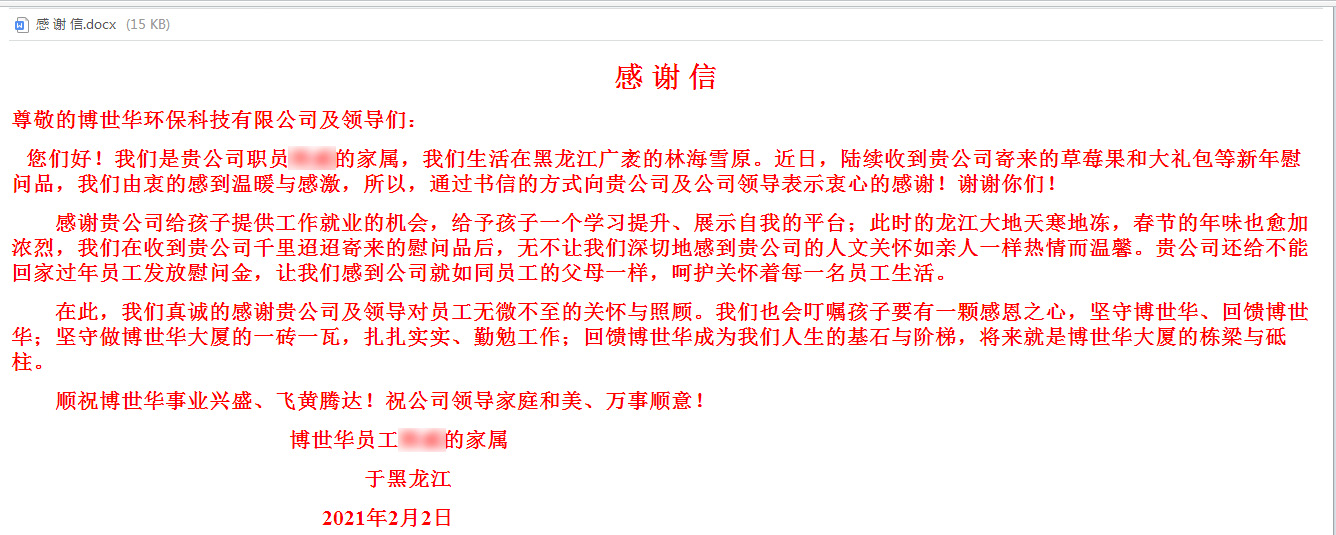 送“溫暖”:公司的發(fā)展壯大,離不開每一位員工家屬的鼎力支持和默默奉獻。公司加大對假期堅守崗位、不能回家與親人團聚的員工的關愛,通過“春節(jié)大禮包寄親人”等活動,把博世華環(huán)保對員工的關心、關愛傳達給留杭、留項目員工家屬。近日,一個個寄托美好祝福的大禮包已陸續(xù)寄送至員工家屬手中,有家屬在收到大禮包后,激動地發(fā)來感謝信,感謝公司就如同員工的父母一樣,呵護關懷著每一名員工生活及成長,同時也表達出對員工主動留杭的支持及理解。
