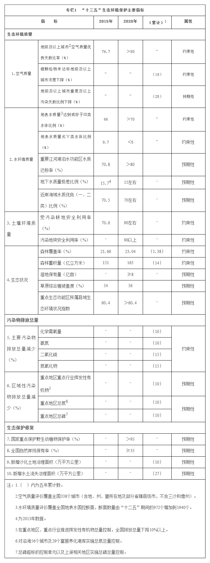 生態環境質量有所改善。2015年,全國338個地級及以上城市細顆粒物(PM2.5)年均濃度為50微克/立方米,首批開展監測的74個城市細顆粒物年均濃度比2013年下降23.6%,京津冀、長三角、珠三角分別下降27.4%、20.9%、27.7%,酸雨區占國土面積比例由歷史高峰值的30%左右降至7.6%,大氣污染防治初見成效。全國1940個地表水國控斷面Ⅰ—Ⅲ類比例提高至66%,劣Ⅴ類比例下降至9.7%,大江大河干流水質明顯改善。全國森林覆蓋率提高至21.66%,森林蓄積量達到151.4億立方米,草原綜合植被蓋度54%。建成自然保護區2740個,占陸地國土面積14.8%,超過90%的陸地自然生態系統類型、89%的國家重點保護野生動植物種類以及大多數重要自然遺跡在自然保護區內得到保護,大熊貓、東北虎、朱鹮、藏羚羊、揚子鱷等部分珍稀瀕危物種野外種群數量穩中有升。荒漠化和沙化狀況連續三個監測周期實現面積“雙縮減”。