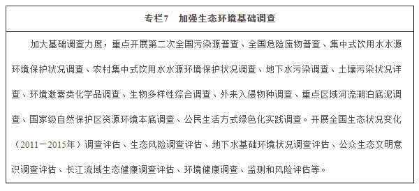 加強生態環保信息系統建設。組織開展第二次全國污染源普查,建立完善全國污染源基本單位名錄。加強環境統計能力,將小微企業納入環境統計范圍,梳理污染物排放數據,逐步實現各套數據的整合和歸真。建立典型生態區基礎數據庫和信息管理系統。建設和完善全國統一、覆蓋全面的實時在線環境監測監控系統。加快生態環境大數據平臺建設,實現生態環境質量、污染源排放、環境執法、環評管理、自然生態、核與輻射等數據整合集成、動態更新,建立信息公開和共享平臺,啟動生態環境大數據建設試點。提高智慧環境管理技術水平,重點提升環境污染治理工藝自動化、智能化技術水平,建立環保數據共享與產品服務業務體系。
