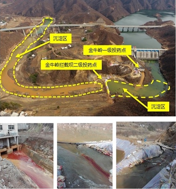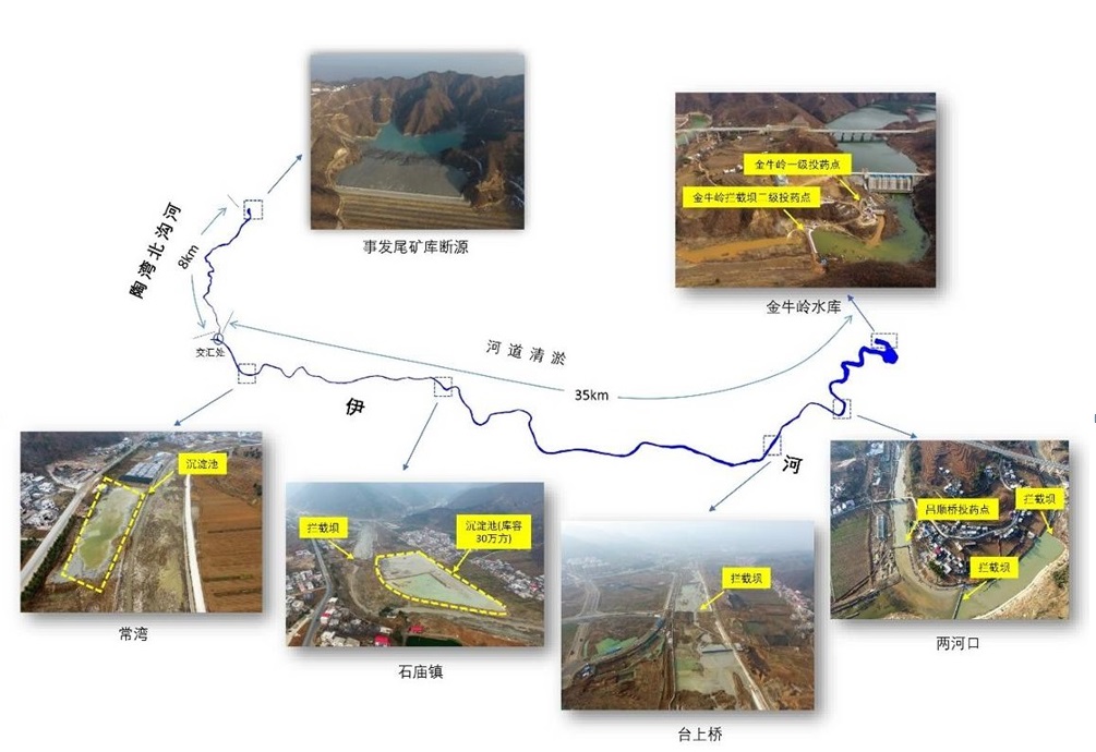 筑壩攔截。2月15日開始,欒川縣人民政府組織在伊河受影響的35公里干流河道分段設(shè)置攔截壩、開挖臨時(shí)沉淀池,在攔截污染水體、調(diào)節(jié)下泄流量、為投藥降污創(chuàng)造有利條件等方面發(fā)揮重要作用。